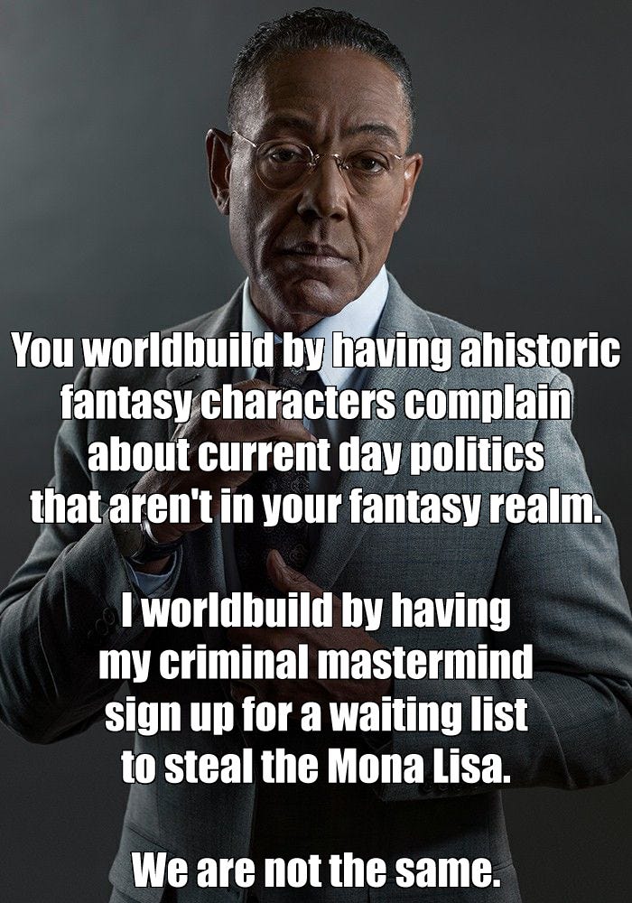 One of the things totally ruining modern fantasy and science fiction is the inelegant injection of current day politics into settings where it would never be a thing.