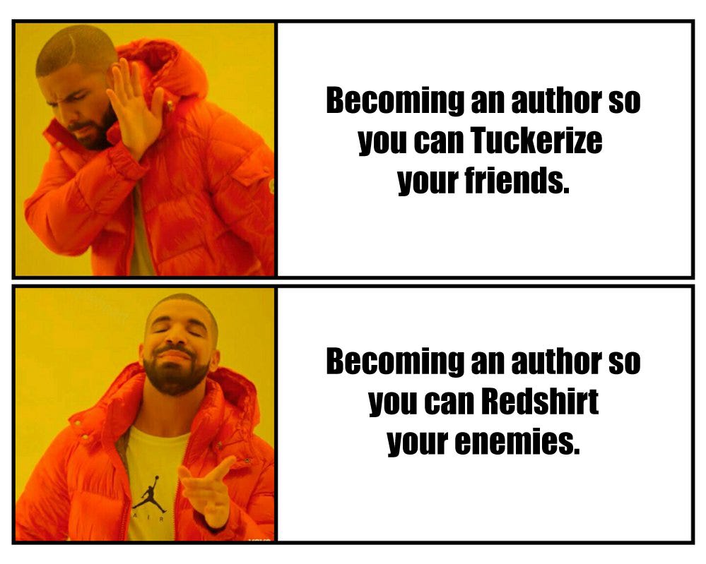 “Redshirting” is deliberately killing someone’s namesake off in your story. It’s named for the countless number of Security team members in red shirts who got killed off on some strange planet in the original Star Trek. It’s not necessarily malicious. There’s a fellow named Joe Buckley who has been killed off in literally dozens of books and short stories. I personally have killed him off one and a half times.