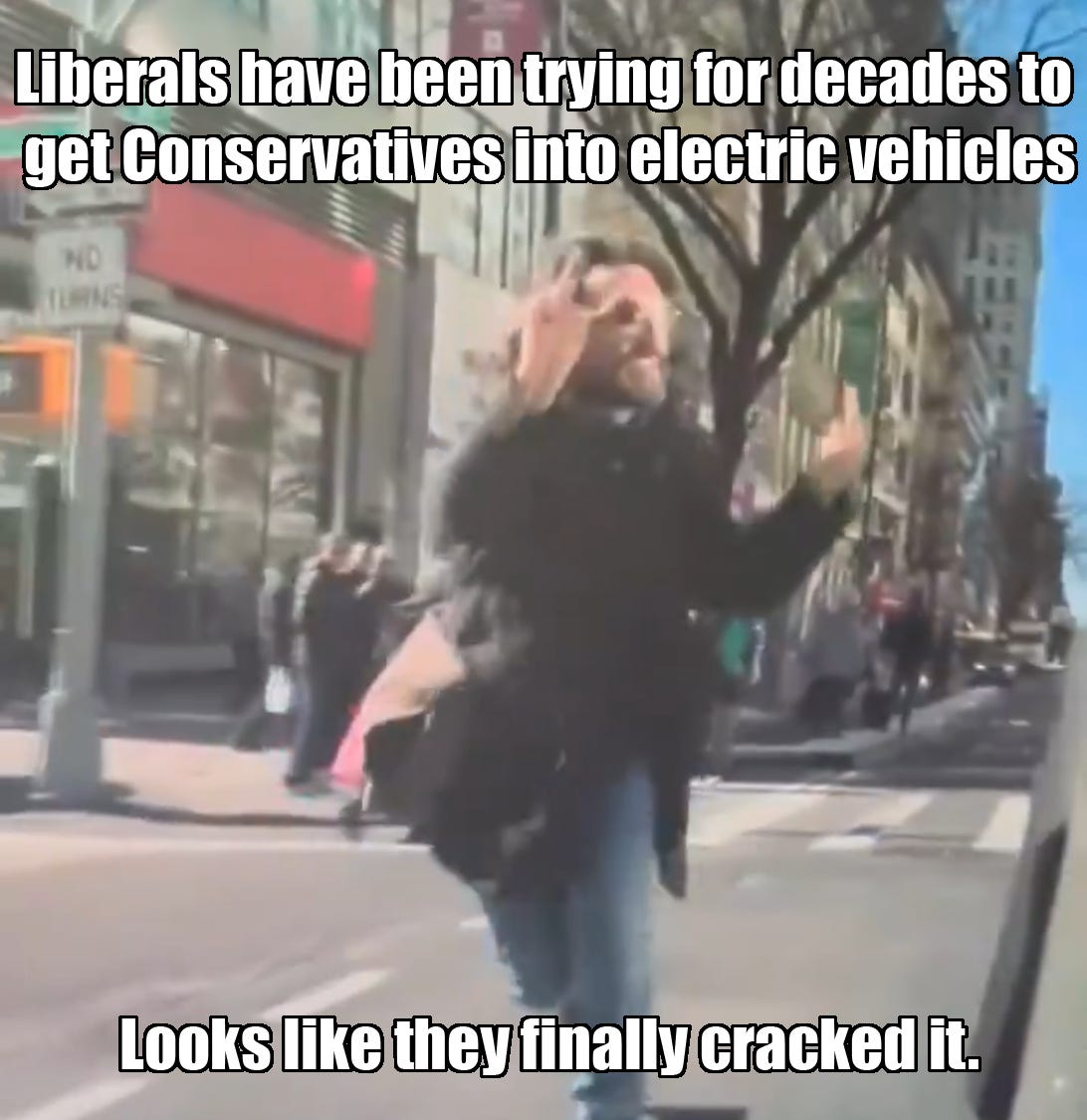 This one is a frame from a video where some deranged leftist (but I repeat myself) chased a Tesla for a block pounding on the window, screaming, and giving the driver the finger. When he finally ran out of steam he nearly faceplanted into the back of a police SUV. Ah, that would have been comedy gold if he’d actually crashed.